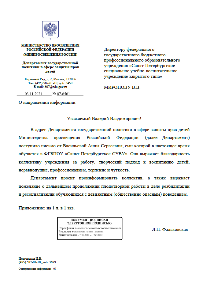 Считаю своим материнским долгом выразить благодарность коллективу Специального учебно-воспитательного учреждение г. Санкт-Петербурга за их огромную работу, творческий подход к воспитанию детей, неравнодушие, профессионализм, терпение и чуткость. Мой ребёнок в настоящее время является воспитанником этого учреждения. За прошедший год, благодаря усилиям педагогического коллектива, он стал уравновешенным, с удовольствием учится и занимается различными видами спорта. Получил золотой значок «ГТО». Под руководством Левис Ирины Юрьевны научился играть на гитаре. Прошу отметить отличную работу коллектива СУВУ, объявить благодарность и (по возможности) поощрить материально.