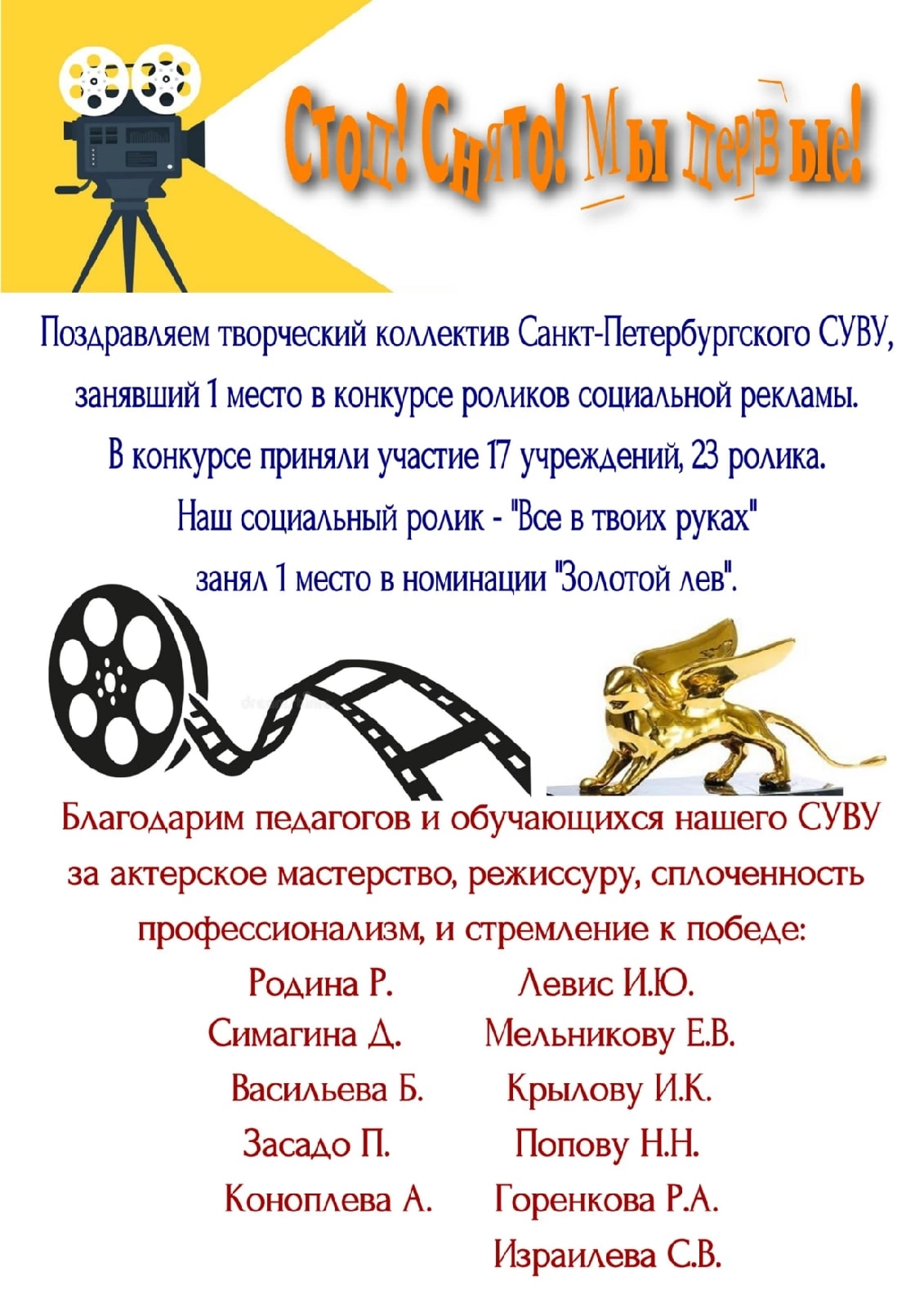 Творческий коллектив справился с задачей полностью, заняв первое место в номинации «Золотой лев» за лучшую актерскую игру!