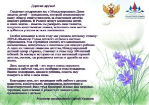 Сердечно поздравляю вас с Международным днем защиты детей – праздником, который символизирует нашу общую ответственность за счастливое детство каждого ребенка. В России живут миллионы детей, и наша задача – помочь им раскрыть свои таланты, получить качественные знания, исполнить свои мечты и добиться успехов во всех начинаниях.